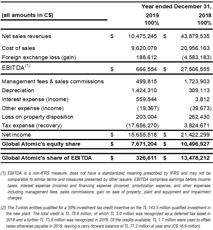 - Positive Net Income generated during 2019 of CDN$3.6 million, despite plant downtime of 7 months for Turkish Plant modernization program