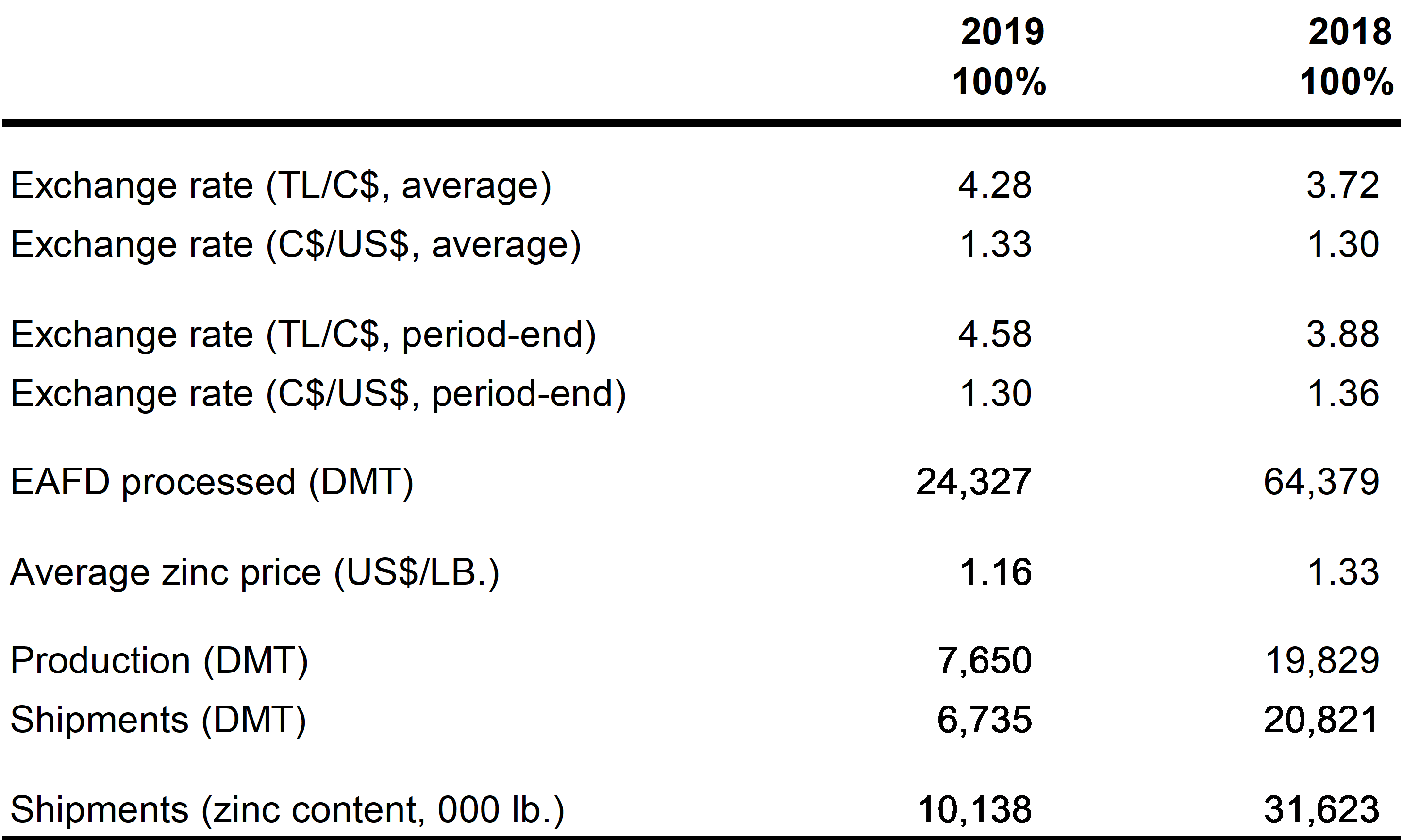 The EAFD Business operating results were significantly lower than 2018 results due to the Iskenderun plant shutdown from the end of January to the beginning of September for the construction and commissioning of the new zinc plant. The Iskenderun plant now has a capacity to process 110,000 tonnes EAFD per annum, an increase from the 65,000 tonne per annum previous capacity. The total cost for the modernization and expansion was US $26.6 million.