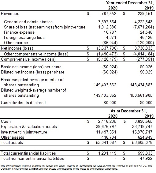 Toronto, ON: Global Atomic Corporation (“Global Atomic” or the “Company”), (TSX: GLO, FRANKFURT: G12, OTCQX: GLATF) announced today its operating and financial results for the year ended December 31, 2020.
