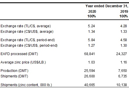 - The Company’s share of the Turkish Zinc Joint Venture (“Turkish JV”) EBITDA was $5.6 million in 2020 ($0.3 million in 2019).