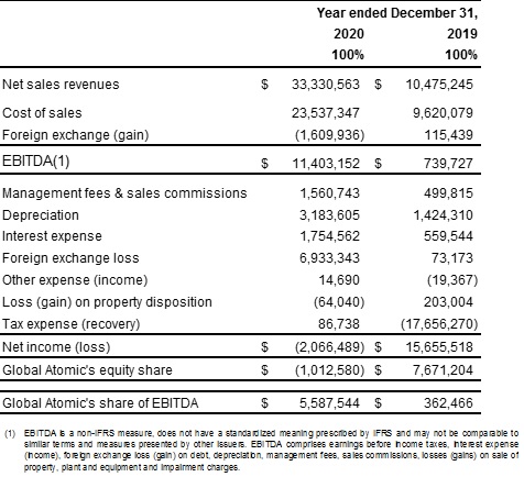 Stephen G. Roman, Chairman, President and CEO commented “The year 2020 was a pivotal year for both of Global Atomic’s businesses and, at the corporate level, we added to our cash position and strengthened the management team and the Board.
