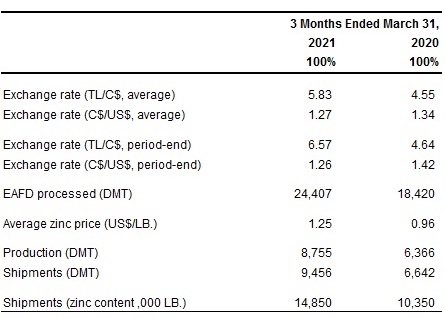 - The Turkish JV processed a record 24,407 tonnes of Electric Arc Furnace Dust (“EAFD”) in Q1 2021, an increase of 32.5% from the 18,420 tonnes processed in Q1 2020.