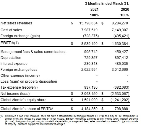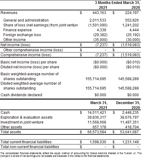 Toronto, ON: Global Atomic Corporation (“Global Atomic” or the “Company”), (TSX: GLO, OTCQX: GLATF, FRANKFURT: G12) announced today its operating and financial results for the three months ended March 31, 2021.