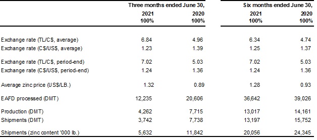 - For the 6 months ended June 30, 2021, the Turkish JV processed 36,642 tonnes EAFD (2020 – 29,026 tonnes) and shipped 20.0 million pounds zinc contained in concentrates (2020 – 24.3 million pounds).