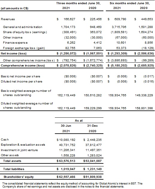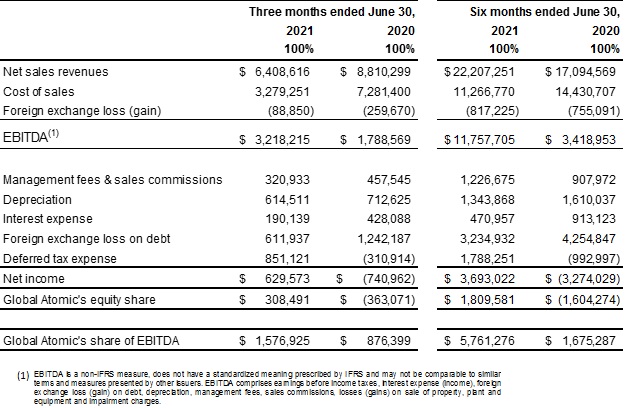 Toronto, ON: Global Atomic Corporation (“Global Atomic” or the “Company”), (TSX: GLO, OTCQX: GLATF, FRANKFURT: G12) announced today its operating and financial results for the three and six months ended June 30, 2021.