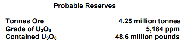 Mining reserve of 4.3 million tonnes grading 5,184 ppm U3O8