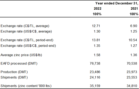 The following table summarizes comparative results for 2022 and 2021 of the Turkish Zinc JV at 100%.