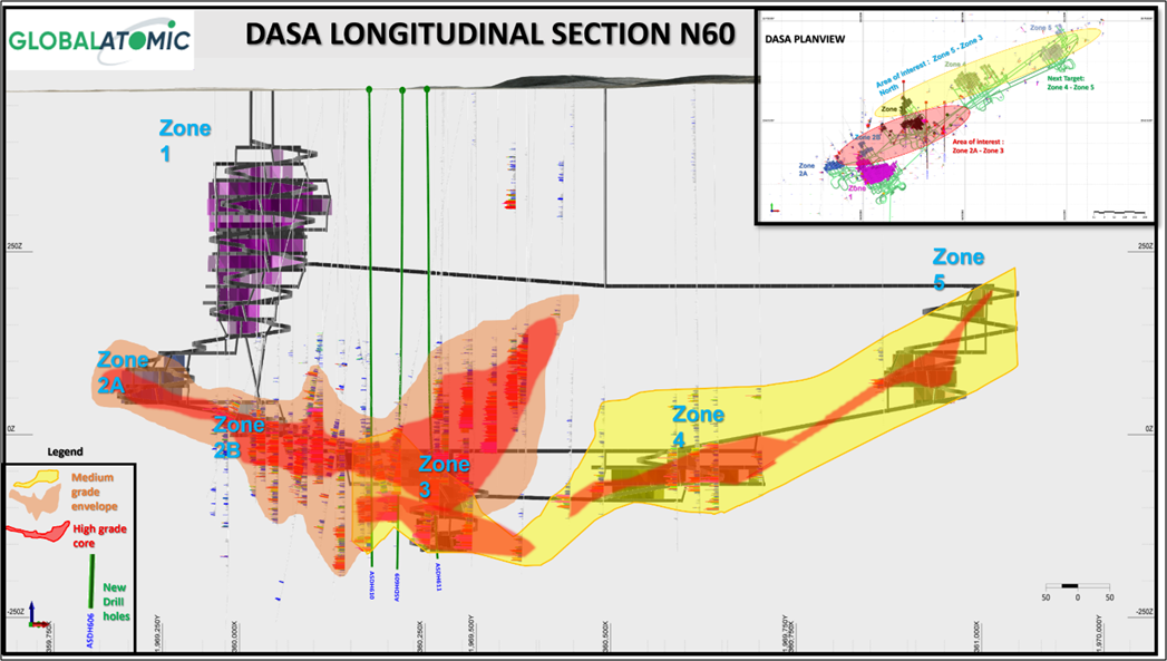 On the strength of results from the overall drill program, Global Atomic is updating the Dasa Mineral Resource Estimate (“MRE”) and will in turn update its Mine Plan which is expected to result in larger and contiguous mining Zones, reduced underground development work between the Zones, lower operating costs and an increase in mineable reserves.