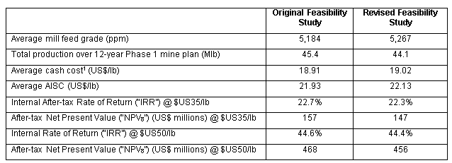 The inferred resources, representing 4.4% of total mineral resources to be mined in Phase I, was treated as zero grade waste in the revised feasibility study. Impacts of this grade change are summarized in the table below: