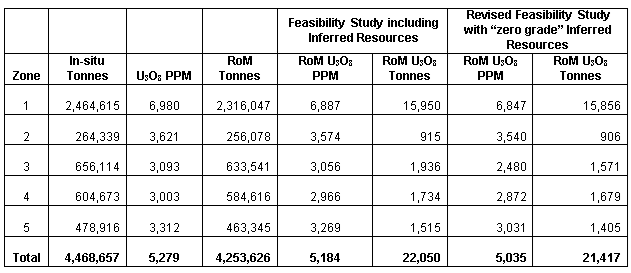 The Zones vary in grades, with Zone 1 contributing the largest portion of the U3O8 tonnes: