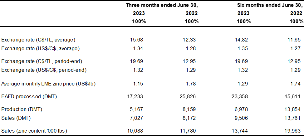 - The Turkish Zinc Joint Venture (“BST” or the “Turkish JV”) plant processed 17,233 tonnes EAFD in Q2 2023 as it resumed operations following the significant earthquakes earlier in the year.