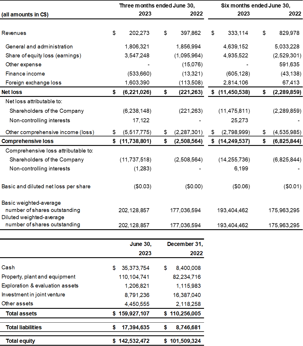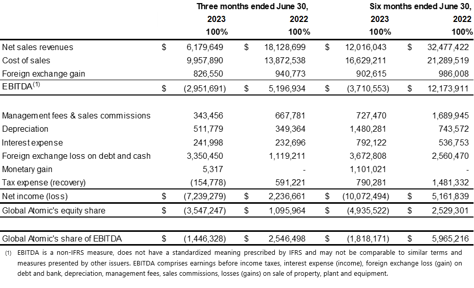 Toronto, ON: Global Atomic Corporation (“Global Atomic” or the “Company”), (TSX: GLO, OTCQX: GLATF, FRANKFURT: G12) announced today its operating and financial results for the three and six months ended June 30, 2023.