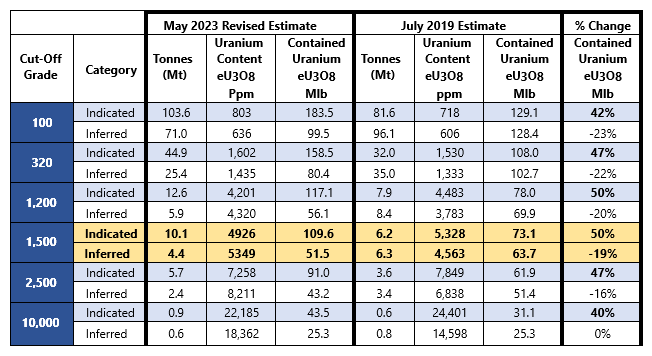 Unlike the 2019 mineral resource estimate, as set out in the Dasa Technical Report, the new mineral resource estimate is focused solely on an underground mine model and does not include open pit modelling of near surface mineralization. As shown in the table below, this had the effect of increasing tonnage with varying impact on grade depending upon the applied cut-off grade. The Indicated Resource using a cut-off grade of 1,500 ppm eU3O8, has increased by 50%: