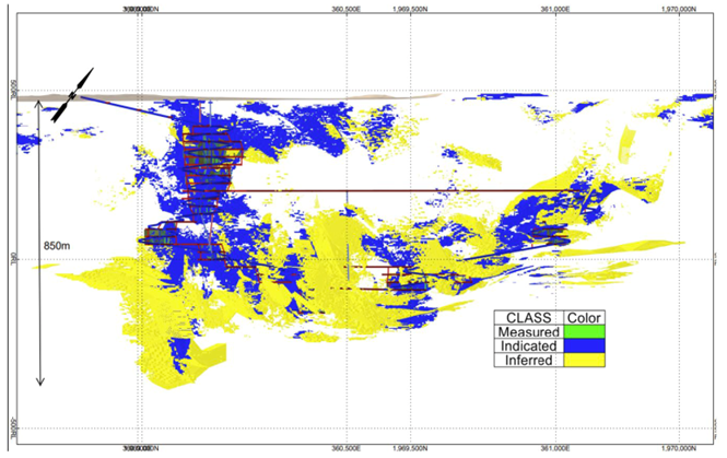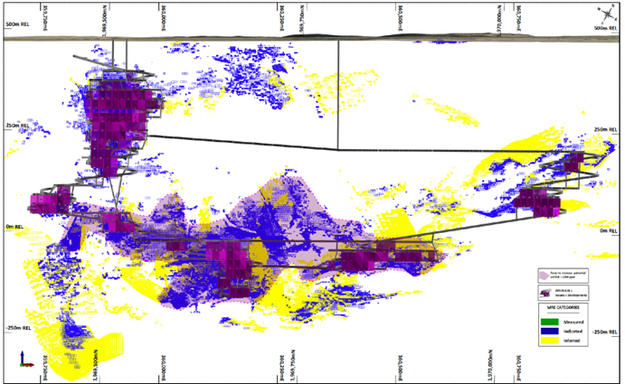 The following resource schematic shows the Indicated and Inferred resources as estimated in the 2019 MRE.