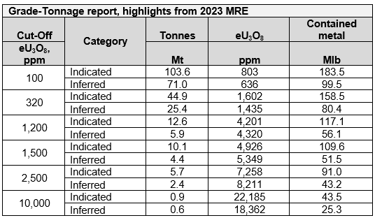 Highlights from the 2023 MRE included a grade-tonnage report at varying cut-off grades and are summarized in the following table: