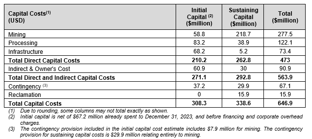 Capital costs for the production period were estimated as follows in the Feasibility Study: