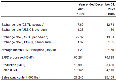 The following table summarizes comparative results for 2023 and 2022 of the Turkish Zinc JV at 100%.