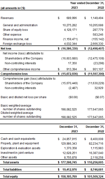 Toronto, ON: Global Atomic Corporation (“Global Atomic” or the “Company”), (TSX: GLO, OTCQX: GLATF, FRANKFURT: G12) announced today its operating and financial results for the year ended December 31, 2023.