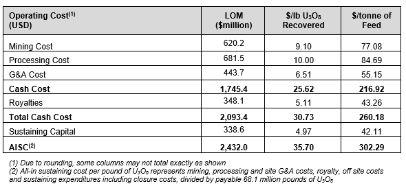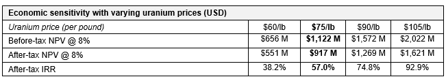The economic analysis for the Study was done via a discounted cash flow (“DCF”) model based on the mining inventory from the 2024 Feasibility Study Mine Plan at a price of US$75 per pound of U3O8. Sensitivity analysis was carried out at price intervals from US$60 per pound to US$105 per pound, as shown in the table below. The DCF includes an assessment of the current tax regime and royalty requirements in Niger. Net present value (“NPV”) figures are calculated using a range of discount rates as shown. The discount rate used for the base-case analysis is 8% (“NPV8”). NPV has been calculated by discounting net cash flows to the start of operations, January 1, 2026, and deducting undiscounted remaining initial capital costs therefrom.