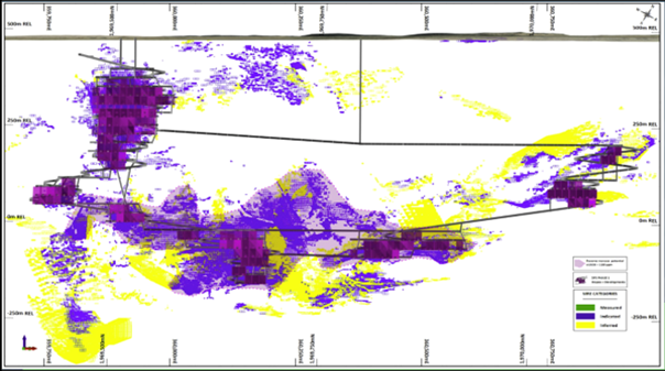 The following resource schematic shows the Indicated and Inferred resources as estimated in the MRE. Indicated Resources are shown in purple and Inferred Resources are shown in yellow.