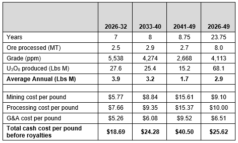 - On March 5, 2024, the Company released the results of its Dasa Uranium Project 2024 Feasibility Study (“FS”) as an update to its 2021 Phase 1 Feasibility Study which confirmed an extension of the Mine Plan from 12 years to 23.75 years (2026-2049), a 50% increase in Mineral Reserves to 73 million pounds U3O8 and an increase in total production by 55% to 68.1 million pounds U3O8. Using an average uranium price of $75/lb U3O8, the FS shows an NPV8 of US$917 million, an IRR of 57% and a payback period of 2.2 years.