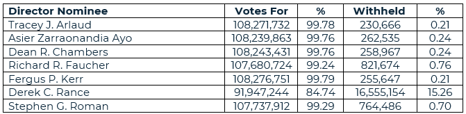 A total of 137,372,872 common shares representing 44.59% of the common shares outstanding as of the Record Date; May 6, 2025 were voted.